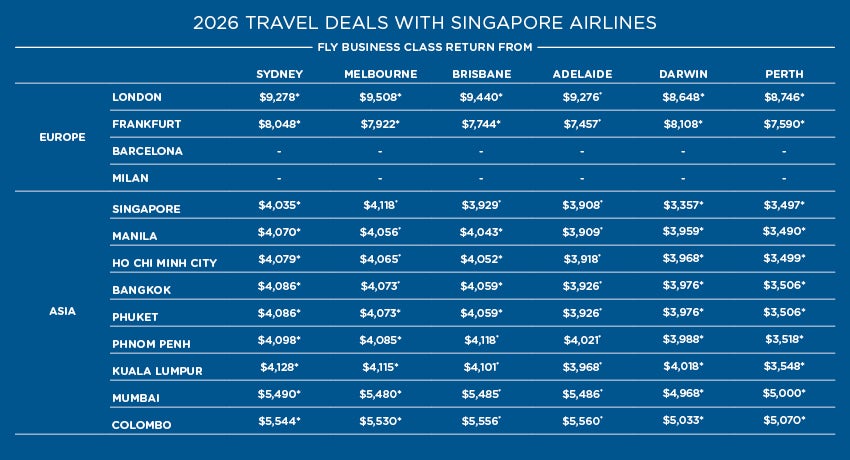 *Conditions apply. Offer valid until 04 February 2026. Prices are per person in Australian dollars and are correct as at 13 January 2026 but may fluctuate if surcharges, fees, taxes or currency change. Agents may charge service fees, rates vary. Prices displayed are from pricing, includes all prepaid taxes and fees, except payment card fees which may be payable in addition, rates vary. Prices displayed are based on the departures dates as displayed. Alternate travel dates are subject to a seasonal surcharge. Day of week surcharges, flight restrictions and blackout dates may apply. ^KrisFlyer is the rewards programme of the Singapore Airlines Group. Please check all prices, availability and other information before booking. Singapore Airlines terms and conditions and Helloworld Travel online Booking Terms and Conditions apply.